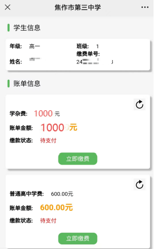 1. 缴费完成后,请重新扫码并输入学生信息进入缴费界面。