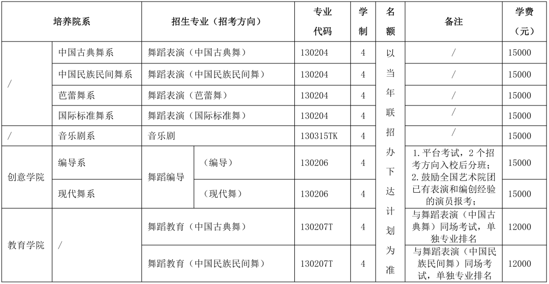 按照有关文件的要求,我院舞蹈表演、舞蹈编导、舞蹈学、舞蹈教育、音乐剧五个校考专业面向全国招生,不编制分省计划,所有艺术类校考专业(含招考方向)均为文理兼招,不设选考科目要求。