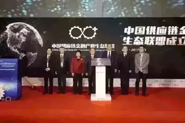 在4月21日举行的“2017中国供应链金融年会”上。主办方中国贸易金融网、贸易金融杂志和中国交易银行50人论坛联合多家机构发起成立了酝酿许久的“中国供应链金融产业生态联盟”,并举行了揭牌仪式。商务部原副部长魏建国、中国交易银行50人论坛主席张燕玲、中国中小企业协会会长张竞强、浦发银行总行公司业务管理部总经理杨斌、社科院金融所银行研究室主任曾刚、海尔集团供应链金融总监杨红星、中国贸易金融网总编辑张志强等业内大咖一起上台为中国供应链金融产业生态联盟举行了揭牌仪式。