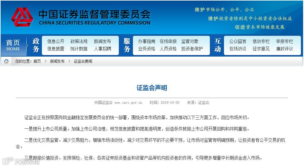 10月19日,中共中央政治局委员、国务院副总理刘鹤就当前经济金融热点问题接受记者采访时表示,促进股市健康发展,一定要有针对性地推出新的改革举措。其中包括:在稳定市场方面,允许银行理财子公司对资本市场进行投资,要求金融机构科学合理做好股权质押融资业务风险管理,鼓励地方政府管理的基金、私募股权基金帮助有发展前景的公司纾解股权质押困难。在鼓励市场长期资金来源方面,加大保险资金财务性和战略性投资优质上市公司力度,壮大机构投资者力量,巩固市场长期投资的基础。
