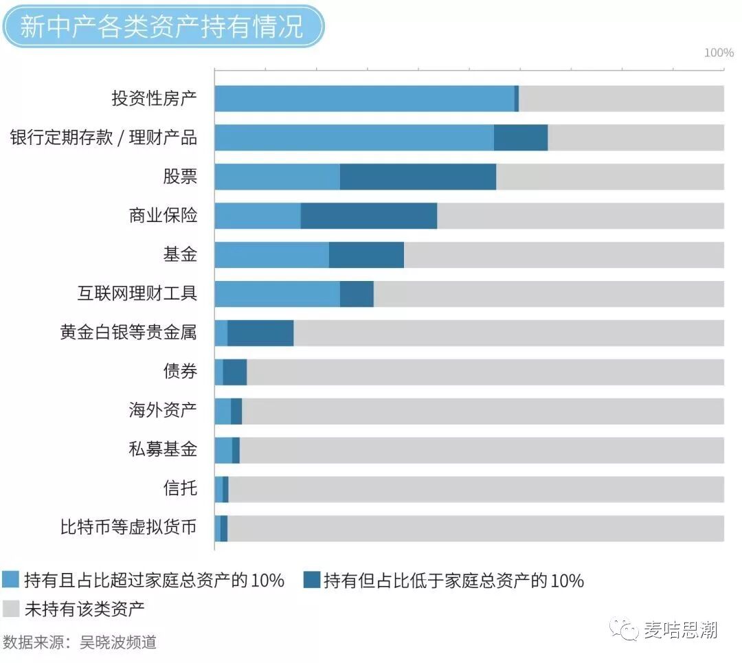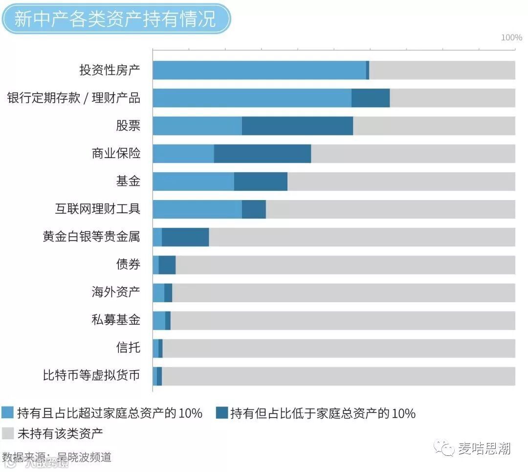 在调查中发现,新中产在理财的几类资产配置上,有银行存款、投资性房产、股票、保险、基金、黄金、信托以及比特币等,他们不会把钱放在同一类资产上,这说明他们的理财意识很强。