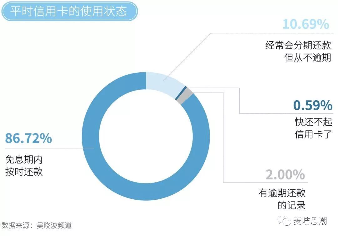 新中产对信用卡的使用亦是如此。我们在调查中发现,大部分新中产在上大学时就申请过信用卡,但是他们基本没有用过。等他们用的时候,也只把信用卡当作一个延期工具,不会去分期。这与我们从小就接受的教育有关,即不到迫不得已、买不起某样东西的时候,不会去借钱。