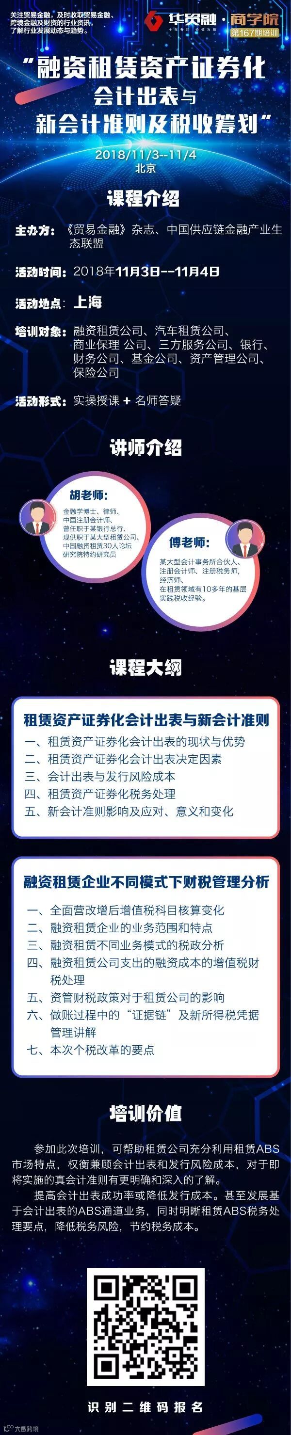 参加此次培训,可帮助租赁公司充分利用租赁ABS市场特点,权衡兼顾会计出表和发行风险成本,对于即将实施的真会计准则有更明确和深入的了解。提高会计出表成功率或降低发行成本。甚至发展基于会计出表的ABS通道业务,同时明晰租赁ABS税务处理要点,降低税务风险,节约税务成本。