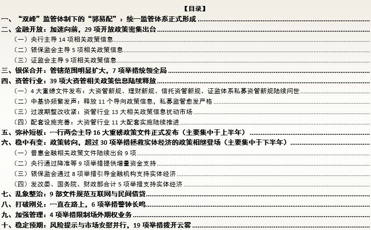 严格来说,“双峰”监管体制下的“郭易配”统一金融监管体系在2018年进行了第一次尝试,在经历200多部政策文件及相关信息的前三个季度后,2018年也是稳中有变被提至战略高位的一年,2018年以来超过30项举措更是直指实体经济痛处。通览这200多部政策信息,我们能够感觉到,无论是从经济基本面还是监管政策维度,抑或是内外环境维度,2018年注定会是被载入史册的一年。