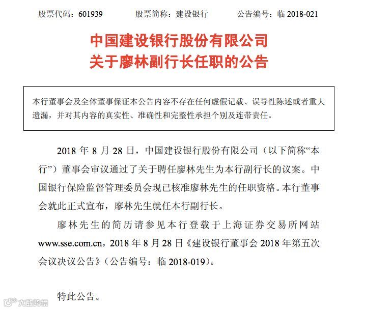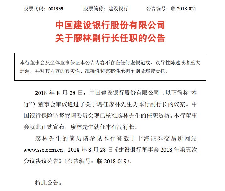 建设银行表示,今年8月28日,该行董事会审议通过了关于聘任廖林先生为该行副行长的议案。银保监会现已核准廖林的任职资格。该行董事会就此正式宣布,廖林就任本行副行长。