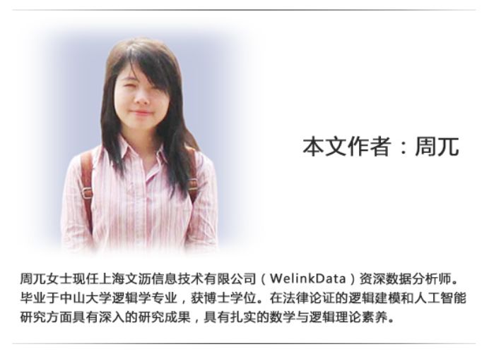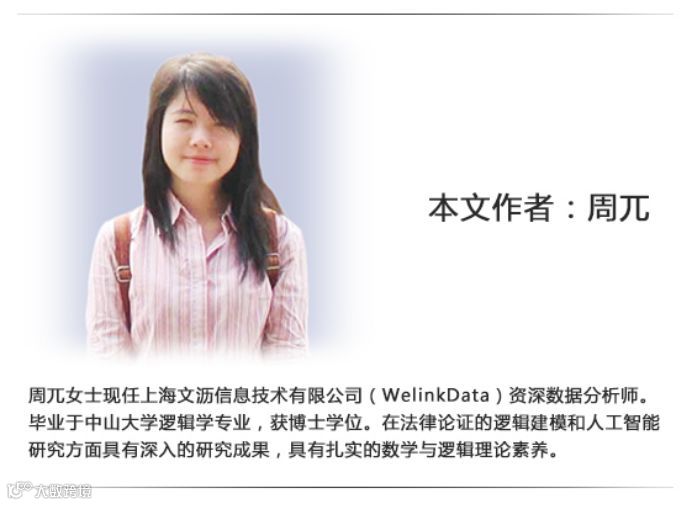 周兀女士现任上海文沥信息技术有限公司(WelinkData)资深数据分析师。毕业于中山大学逻辑学专业,获博士学位。在法律论证的逻辑建模和人工智能研究方具有深入的研究成果,具有扎实的数学与逻辑理论素养。