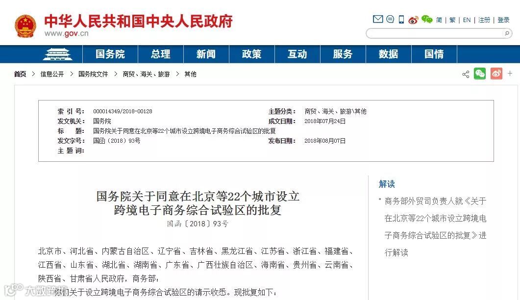 跨境电子商务综合试验区的批复