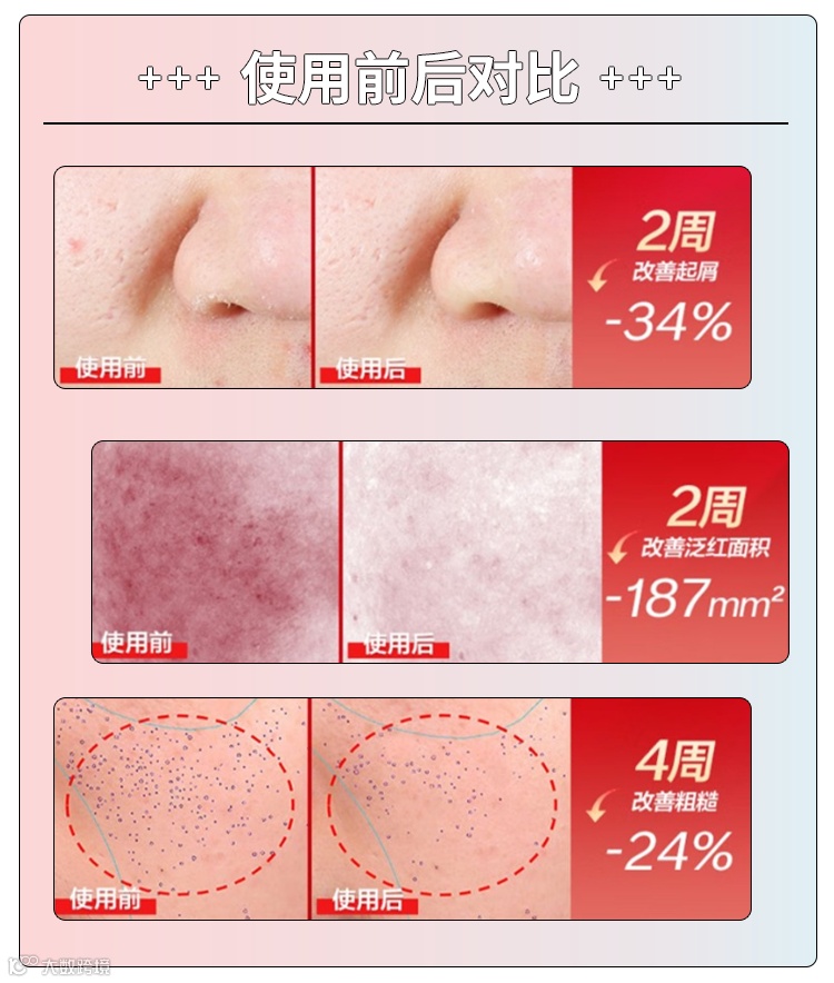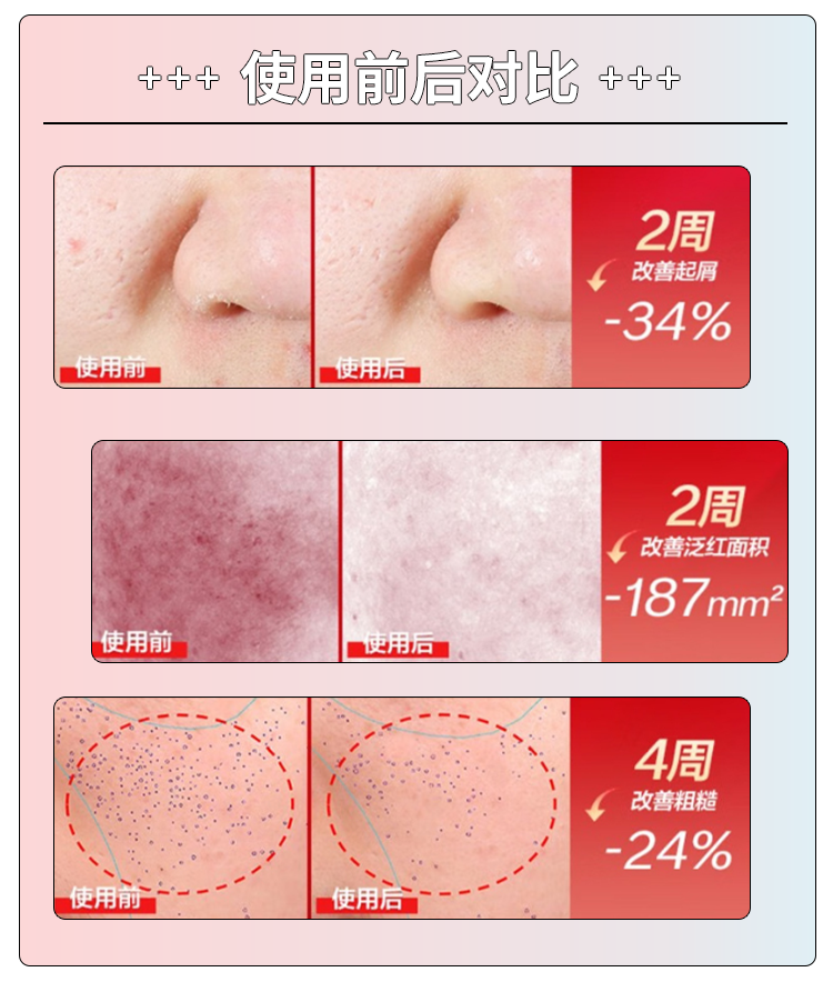 除以上效果之外,还有补水保湿、提亮肤色、美白淡斑、提拉收紧效果????长时间使用后,不怕素颜出门!扛得住镜头的”挑剔“~