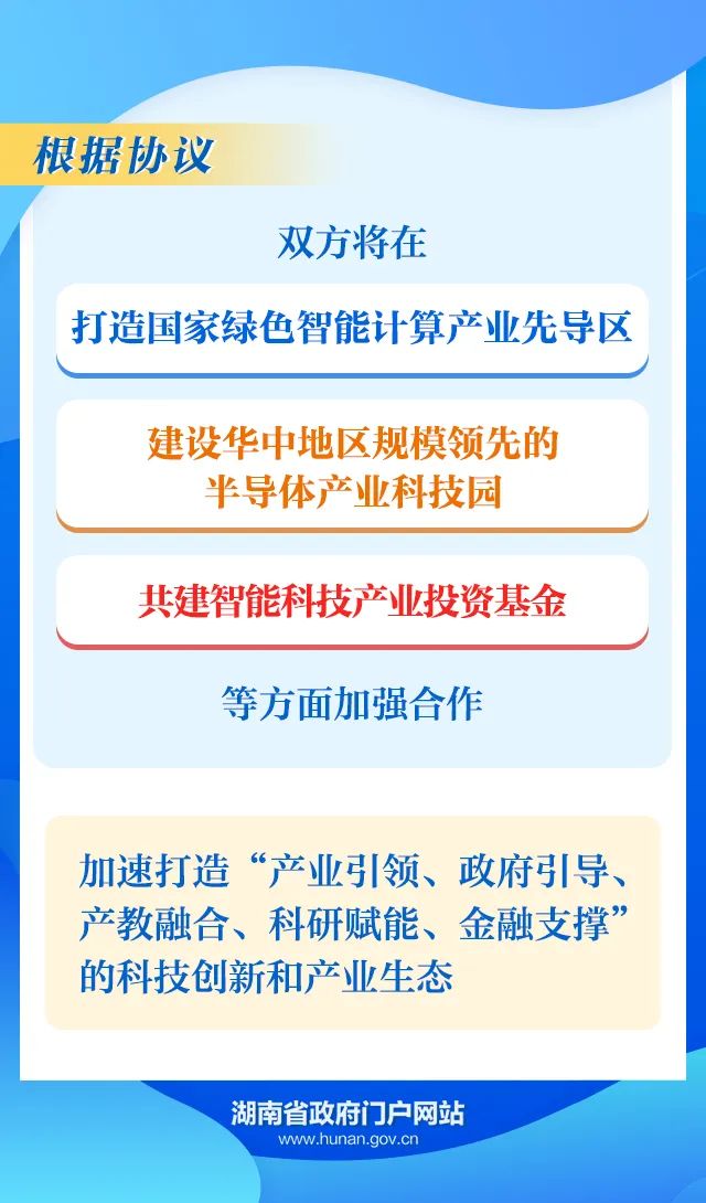 根据协议,双方将在打造国家绿色智能计算产业先导区、建设华中地区规模领先的半导体产业科技园、共建智能科技产业投资基金等方面加强合作,加速打造“产业引领、政府引导、产教融合、科研赋能、金融支撑”的科技创新和产业生态。