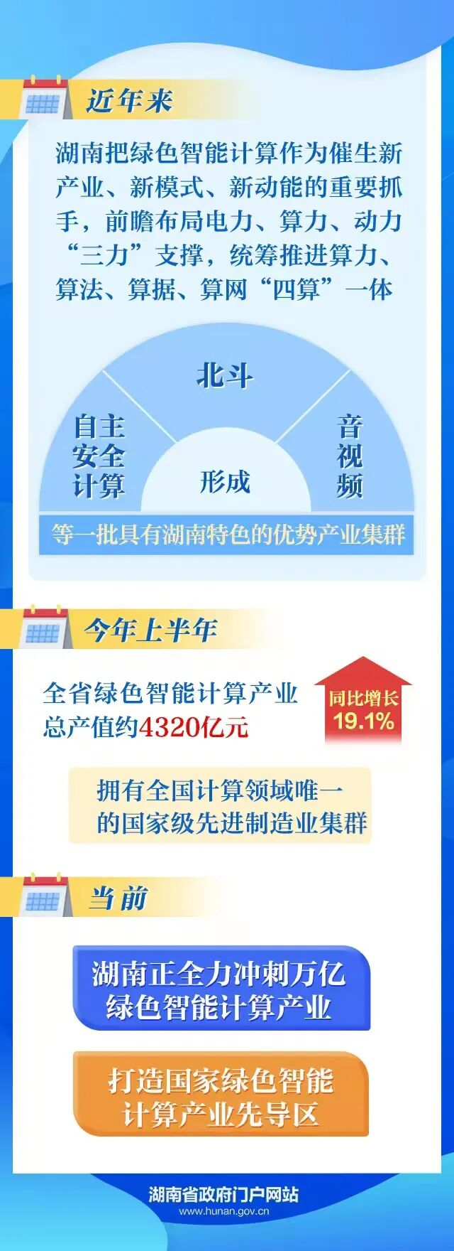 他说,近年来,湖南把绿色智能计算作为催生新产业、新模式、新动能的重要抓手,前瞻布局电力、算力、动力“三力”支撑,统筹推进算力、算法、算据、算网“四算”一体,形成自主安全计算、北斗、音视频等一批具有湖南特色的优势产业集群。今年上半年,全省绿色智能计算产业总产值约4320亿元、同比增长19.1%,拥有全国计算领域唯一的国家级先进制造业集群。