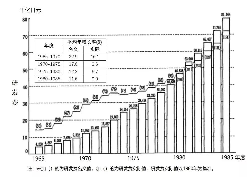 上个世纪七十年代的两次石油危机对世界经济造成了很大的冲击,但在节能环保等产业的带动下,日本的国内生产总值仍然实现了大幅增长 [9]。1970年日本的GDP只有2.03千亿美元,至1980年时日本的GDP已增长至1.071万亿美元 [7]。伴随着经济的高速增长,这一时期日本的研发经费投入总额也在不断攀升。1980年的研发经费投入总额又在1970年的基础上增长了3.9倍。参见图4 [10]。