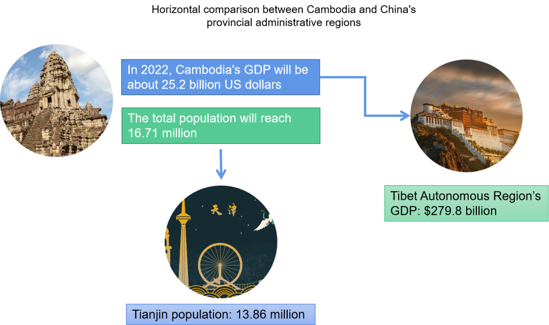In 2022, Cambodia's GDP is expected to reach about 25.2 billion US dollars, which is similar to the estimated GDP of 29.8 billion US dollars in Tibet, China; the total population of Cambodia is expected to reach 16.71 million people, equivalent to the estimated population of Tianjin In China.