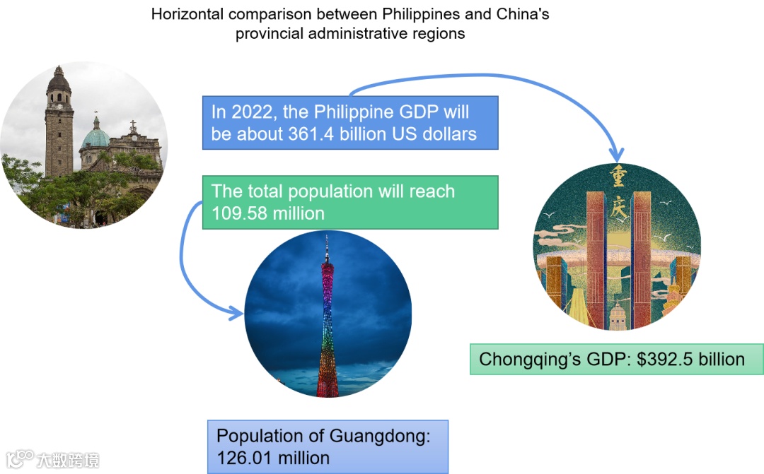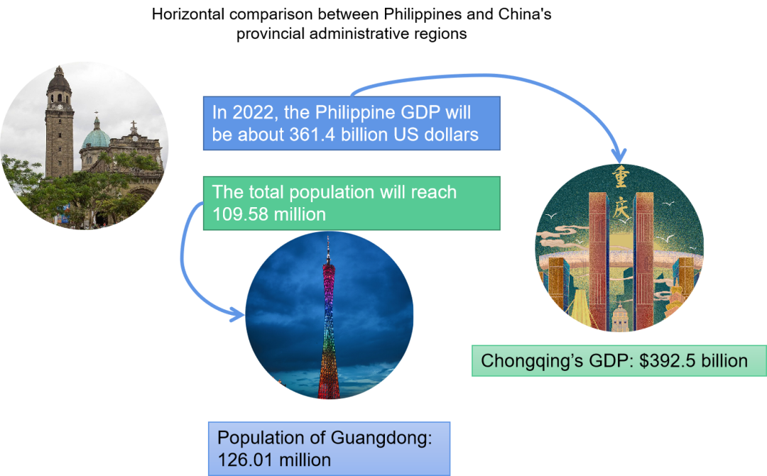 According to current data estimates, the GDP of the Philippines in 2022 is about 361.4 billion US dollars, and the total population will reach 109.58 million people, while the GDP data of Chongqing City in China is estimated at 92.5 billion US dollars, and the total population is similar to the estimated 126.01 million people in Guangdong Province.