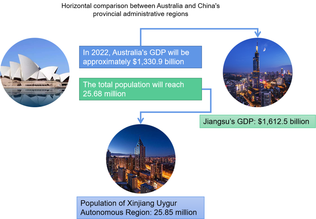 According to the data, Australia's GDP will reach $1,330.9 billion in 2022, similar to the $1,612.5 billion in China's Jiangsu Province; Australia is sparsely populated and has a total population of about 25.68 million people, which is similar to the new Tibetan Uyghur Autonomous Region in the same situation in China.