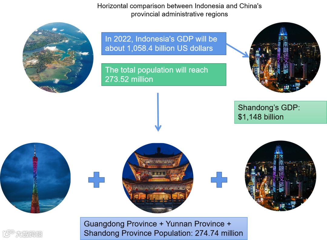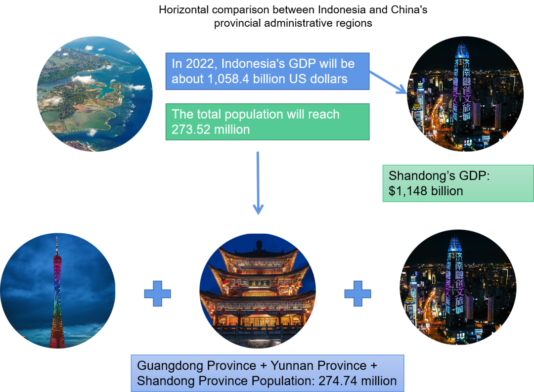 It is estimated that Indonesia's GDP in 2022 will be about 1,058.4 billion US dollars, which is similar to the GDP estimated value of Shandong Province in China (1,148 billion US dollars); the Indonesian population is expected to reach 273 million people, which is equivalent to the sum of the estimated population of Guangdong, Yunnan and Shandong provinces.