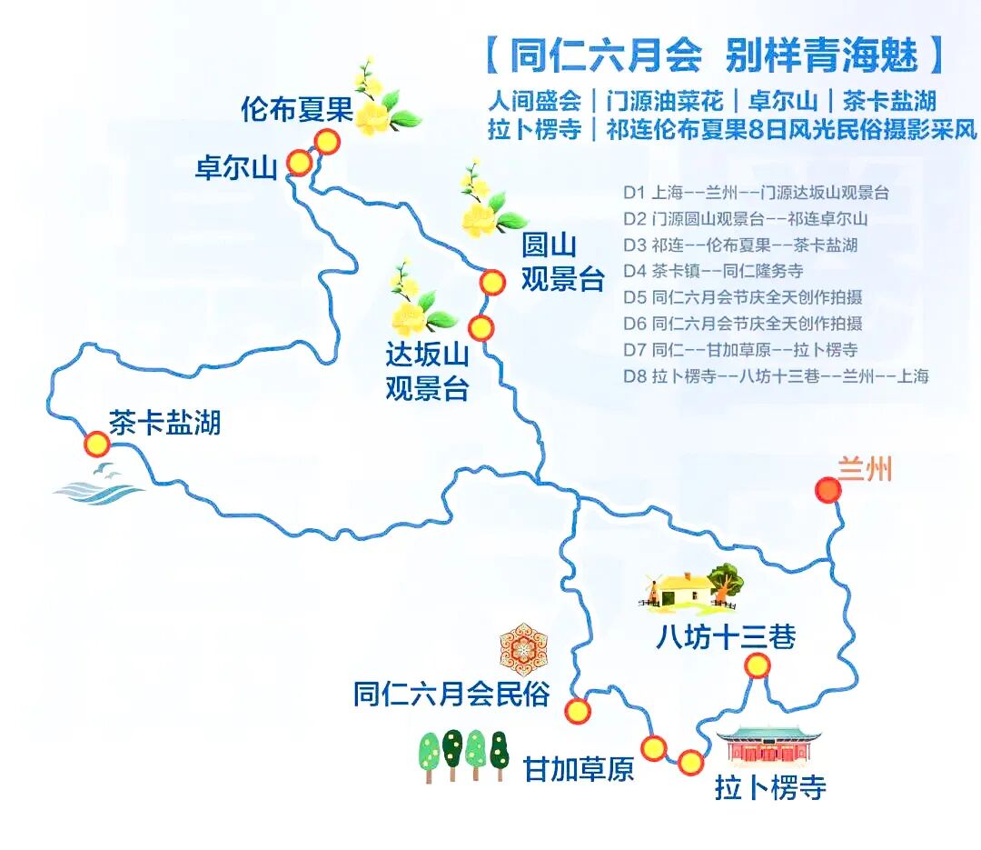 (兰州至门源约380公里,约5.5小时)参考航班:具体信息以实际开票为准(托运行李20KG,提前一天入住浦东)。 9C6451,07:30-10:40,上海浦东T2-兰州中川T3。