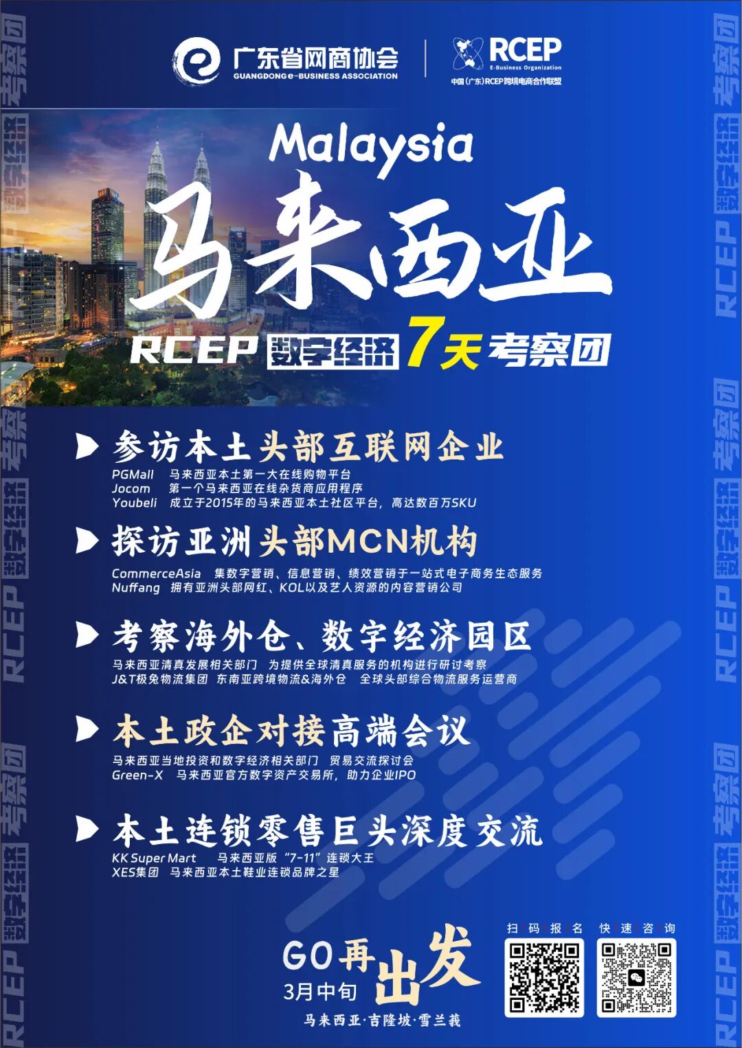 It has been one year since the entry into force and implementation of the RCEP agreement. The construction of the world's largest free trade zone has brought huge new business opportunities to Chinese enterprises. In order to help member enterprises grasp the general trend of RCEP, better seize the investment opportunity, and develop overseas markets, China(Guangdong)-RCEP Cross Border E-commerce Cooperation Organization will organize a series of activities for the digital economy investigation of RCEP member countries from March 2023, and the first stop will be to visit Malaysia (Mar19-25).