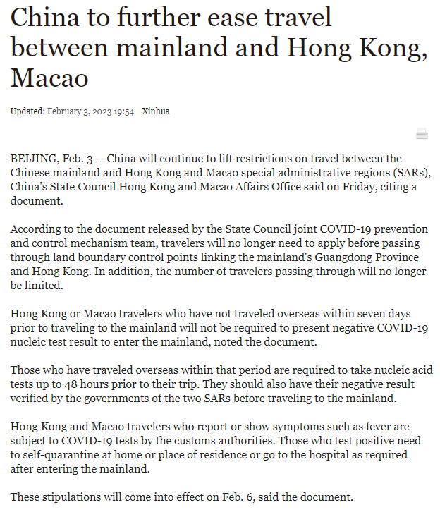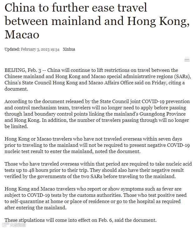 The State Council recently issued the Notice on “China to further ease travel between mainland and Hong Kong, Macao". In order to provide greater convenience for personnel exchanges between the Mainland and Hong Kong, Macao, and further optimize the measures for personnel exchanges between the Mainland and Hong Kong, Macao, the "Notice" will come into effect at midnight on February 6, 2023.
