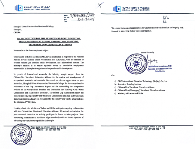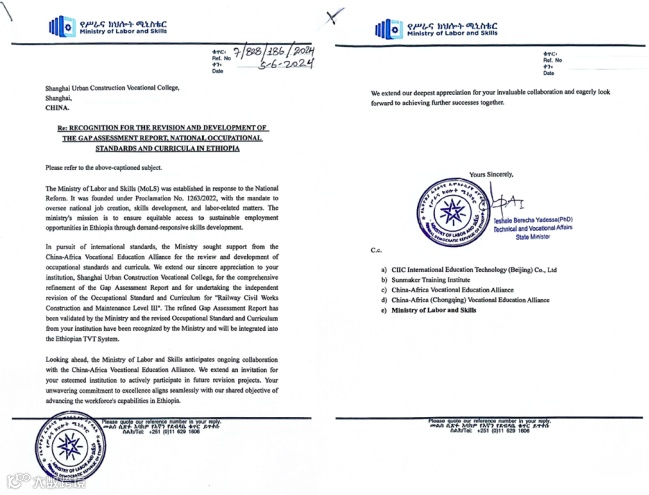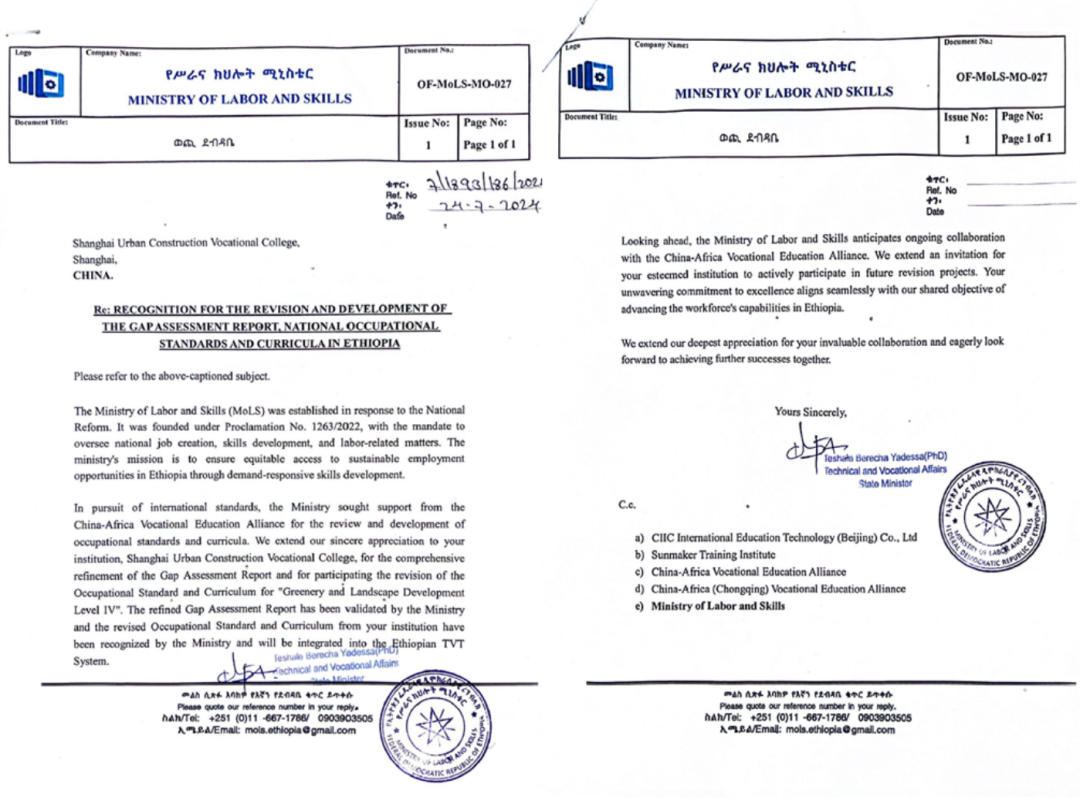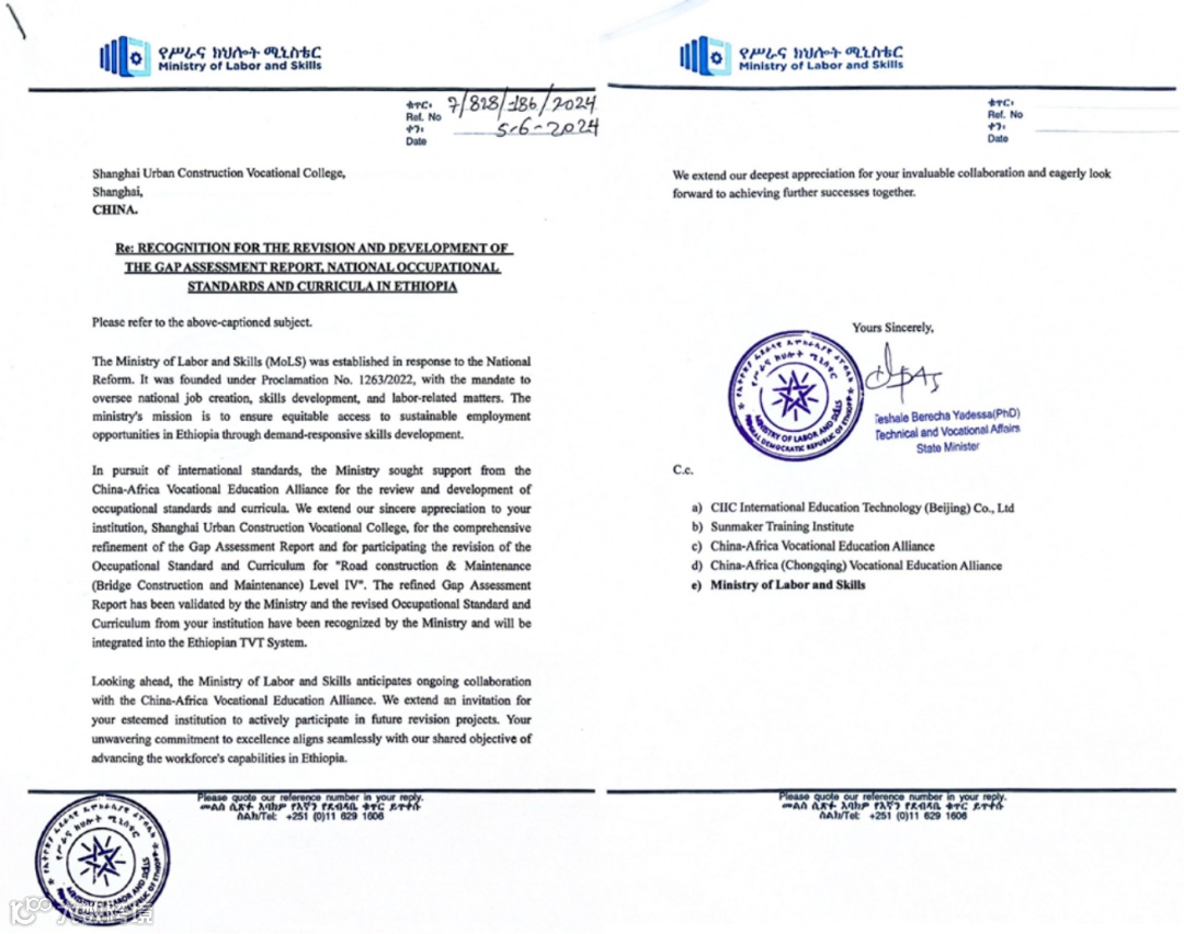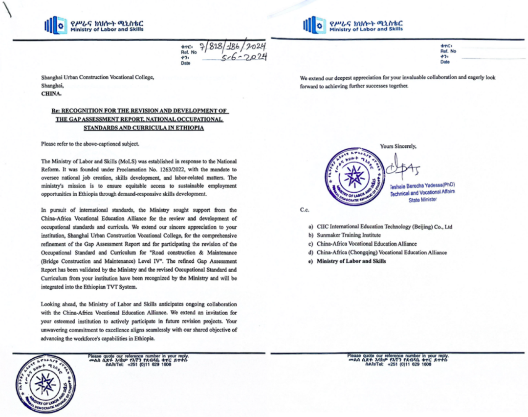 近日,中非职业教育联盟公布了“埃塞俄比亚国家职业标准开发项目”首批认证清单(中非职教函【2024】20号),其中由我校市政与生态工程学院牵头开发的“铁路土建施工与维护技术员/工程师III级”、参与开发的“道路建设与维护技术员(桥梁建设与维护方向)IV级”和“绿化与景观开发技术员/工程师IV级”三项国家职业标准通过了埃塞俄比亚劳动与技能部审核认证, 并签发认证函,正式纳入埃塞俄比亚国家职业教育体系。三项国家职业标准分别由市政与生态工程学院专任教师邓益兵、李娜娜、徐冬梅主持开发。