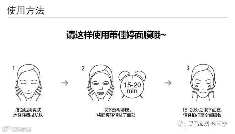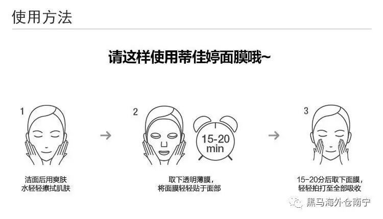 使用方法:洗脸后,用爽肤水调理肌肤之后使用,待15分钟后取下。