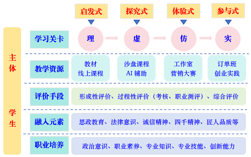 同时,积极推进“一主四式”人才培养模式:立足学生主体,通过启发式(理论学习),探究式(沙盘虚仿与软件实操),体验式(教师工坊、营销大赛、创业导师工作室、“导师+项目+学生”项目、专业社团等)、参与式(订单班、创业实践等)四大培养方式,系统构建人才培养体系,全面提升专业人才培养质量。