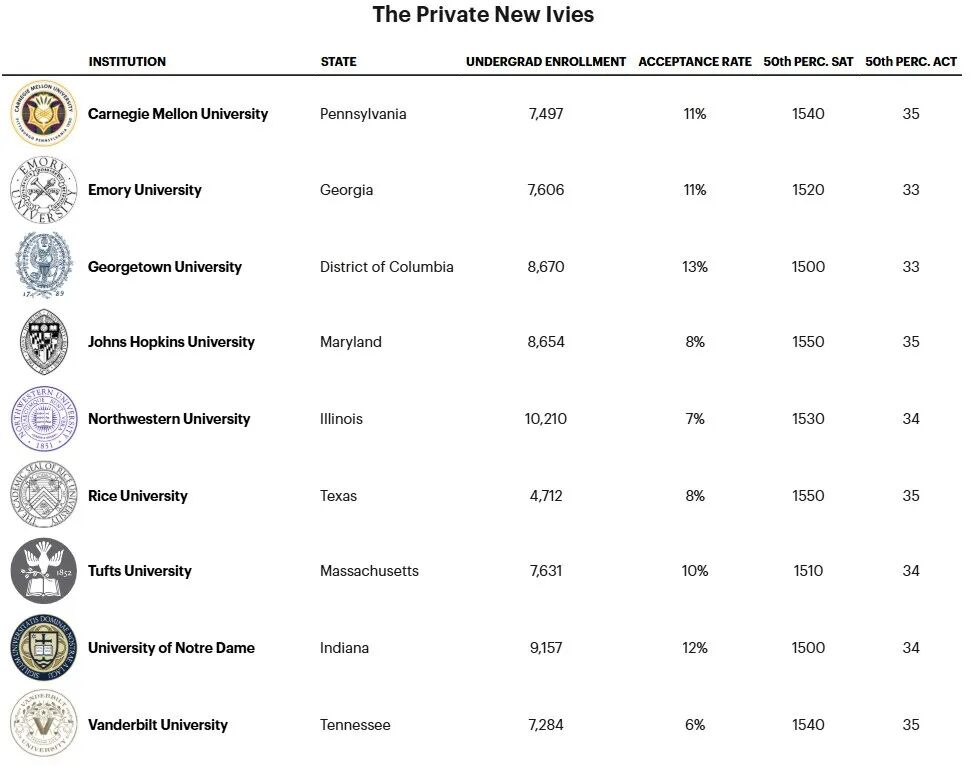 以下是十所公立新常春藤:佐治亚理工学院、普渡大学、德州大学奥斯汀、美国军事学院、伊利诺伊大学香槟、密歇根大学安娜堡、北卡大学教堂山、匹兹堡大学、弗吉尼亚大学、威廉玛丽学院。