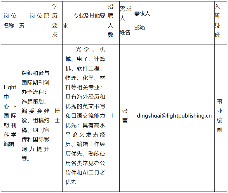 国际期刊科学编辑(Light中心,入所身份为事业编制人员),详情如下:
