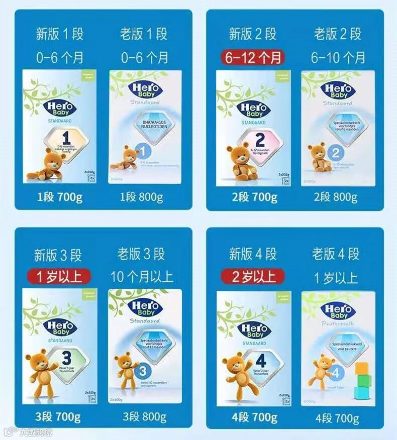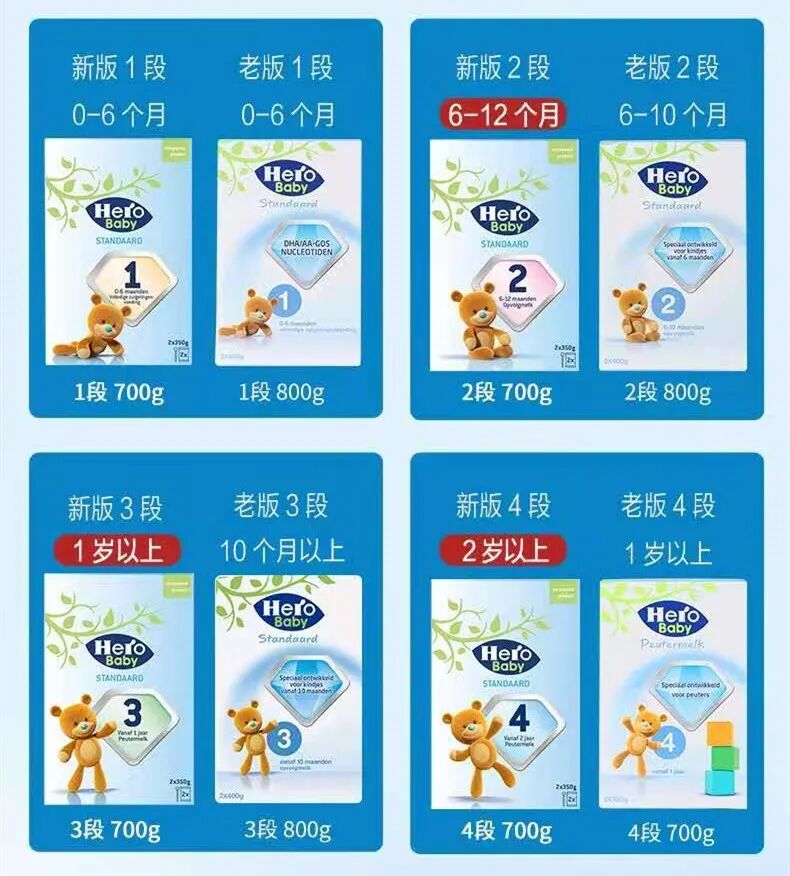 2020年升级版的Hero Baby新配方奶粉,由旧版的1-5段,变成了新版的1-4段,包装设计也全部更新换代。
