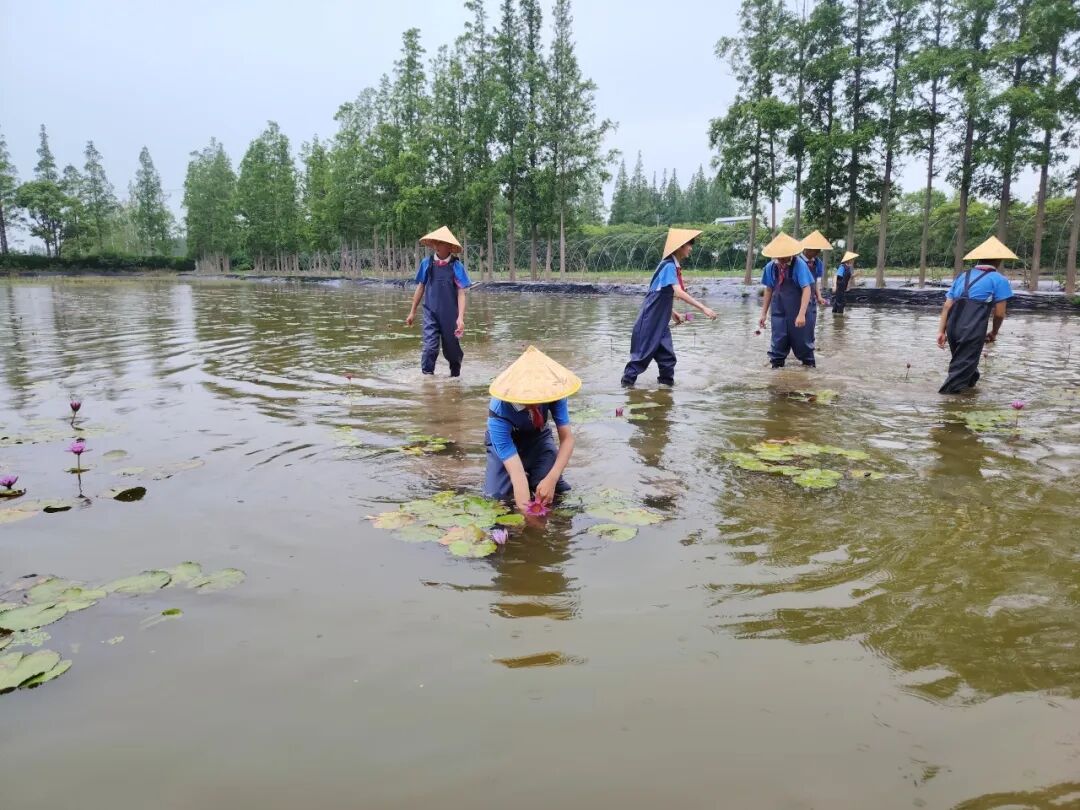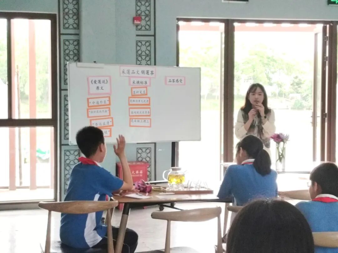 课程以“文化传承+劳动实践+商业创新”为主线,巧妙构建了沉浸式的学习场景。刘老师首先引导学生从《爱莲说》的经典文本出发,提炼出“中通外直”“出淤泥而不染”等莲花特质,并进一步探讨出“茎秆笔直”“花瓣洁净无泥渍”等采莲标准。随后,学生们带着这些文化标准亲自下水采莲,在实践中深化对文本的理解。