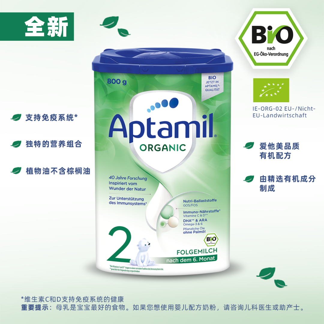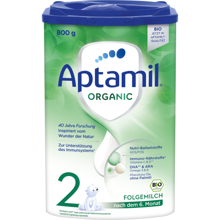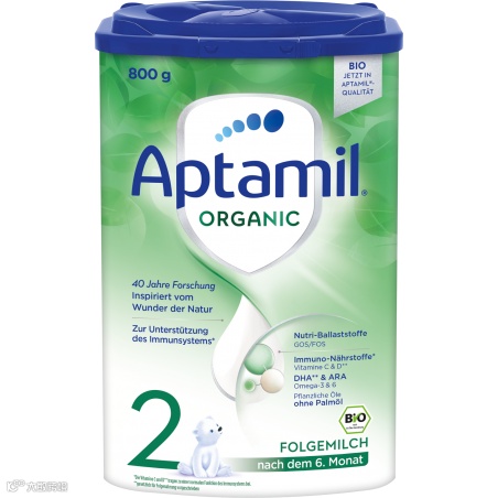 Aptamil Organic 2经过有机认证:它包含95%的有机成分,不含牛磺酸和核苷酸。仅使用不含棕榈油的植物油,这是有机系列的独特之处。
