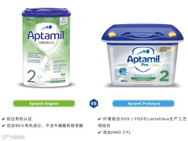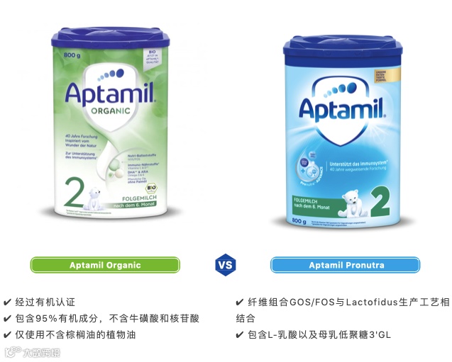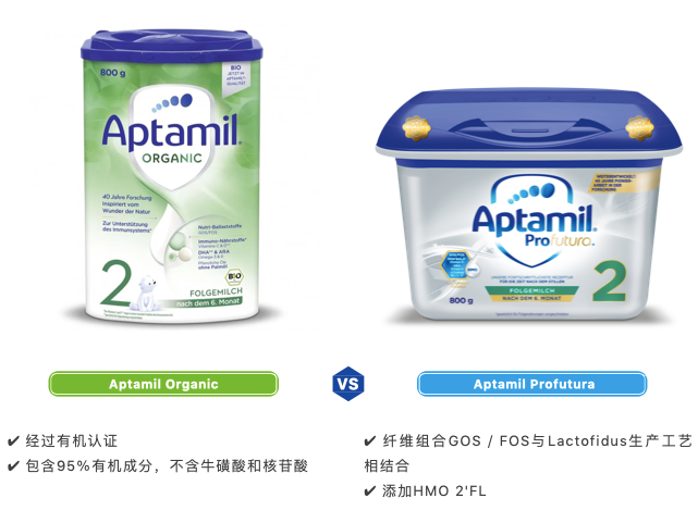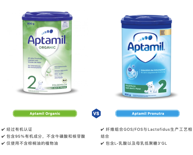 两种产品提供相同的饱腹感,因此它们具有相同的能量(千卡)。我们的配方不添加淀粉,仅包含乳糖作为可消化的碳水化合物。Aptamil Organic 2是德国零售中唯一不含淀粉的有机成长奶粉。