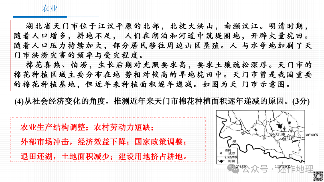(4)从社会经济变化的角度,推测近年来天门市棉花种植面积逐年递减的原因。(3分)