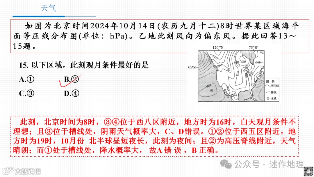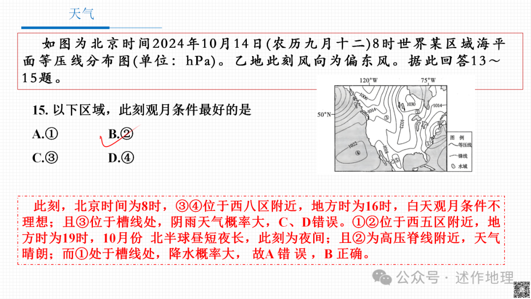 且③位于槽线处,阴雨天气概率大,C、D错误。①②位于西五区附近,地方时为19时,10月份 北半球昼短夜长,此刻为夜间;且②为高压脊线附近,天气晴朗;而①处于槽线处,降水概率大, 故A 错 误 ,B 正确。