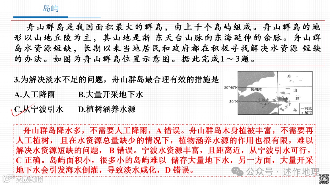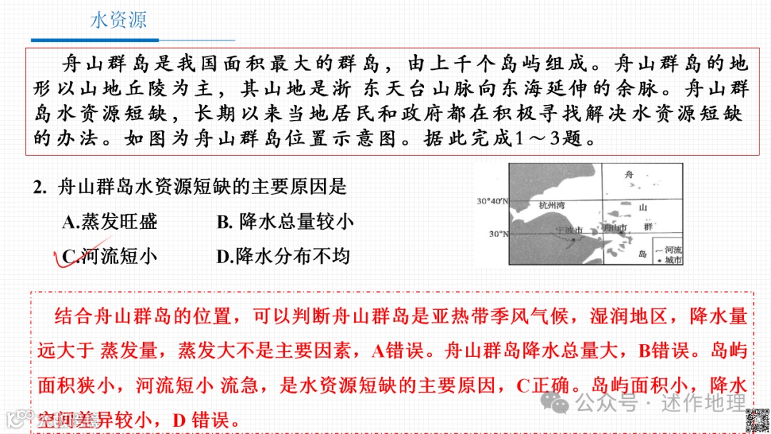 2.C【 解析】结合舟山群岛的位置,可以判断舟山群岛是亚热带季风气候,湿润地区,降水量远大于 蒸发量,蒸发大不是主要因素,A错误。舟山群岛降水总量大,B错误。岛屿面积狭小,河流短小 流急,是水资源短缺的主要原因,C 正确。岛屿面积小,降水空间差异较小,D 错误。