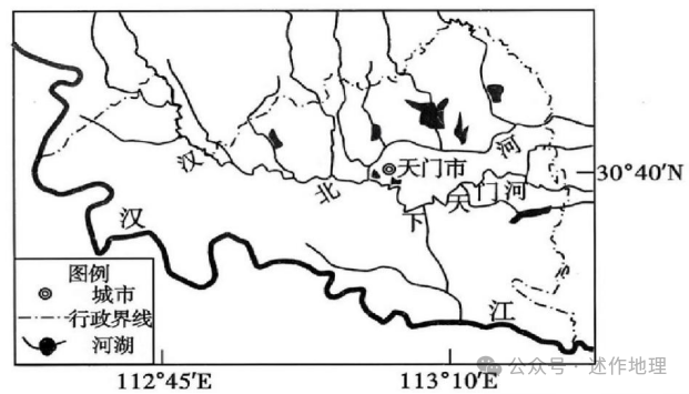 棉花喜热、怕涝,生长后期对光照要求高,要求土壤疏松深厚。天门市的棉花种植区域主要分布在地 势相对较高的旱地垸田中。天门市曾是我国重要的棉花种植基地,但近年来种植面积逐年递减。如图为天 门市示意图。