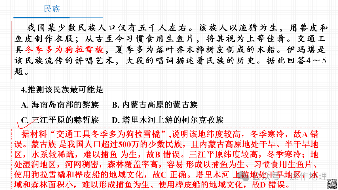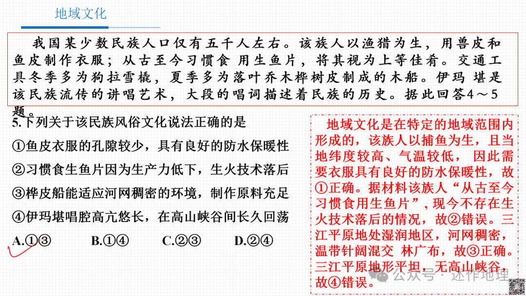 4.C【 解析】据材料“交通工具冬季多为狗拉雪橇”,说明该地纬度较高,冬季寒冷,故A 错误。蒙古族 是我国人口超过500万的少数民族,且内蒙古高原地处干旱、半干旱地区,水系较稀疏,难以捕鱼 为生,故B 错误。三江平原纬度较高,冬季寒冷;地处湿润地区,河网稠密,森林覆盖率高,容易 形成以捕鱼为生、习惯食用生鱼片、使用狗拉雪橇和桦皮船的地域文化,故C 正确。塔里木河 上游地处干早地区,水域和森林面积小,难以形成捕鱼为生、使用桦皮船的地域文化,故D 错误。