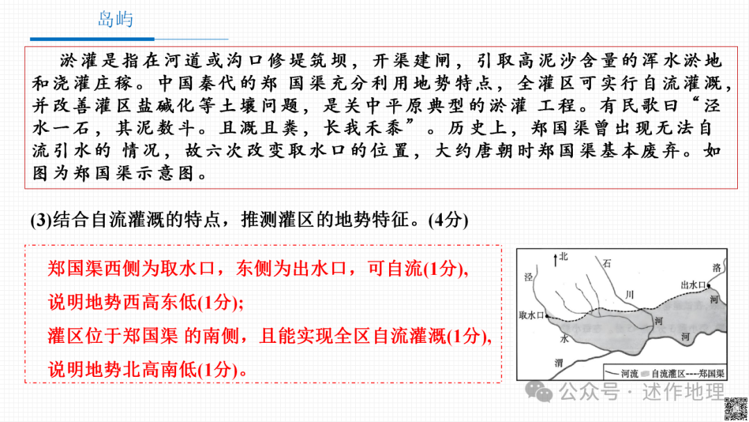 郑国渠西侧为取水口,东侧为出水口,可自流(1分),说明地势西高东低(1分);灌区位于郑国渠 的南侧,且能实现全区自流灌溉(1分),说明地势北高南低(1分)。