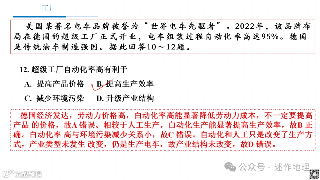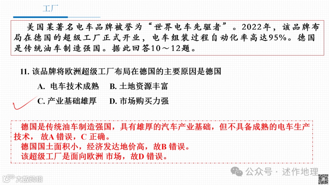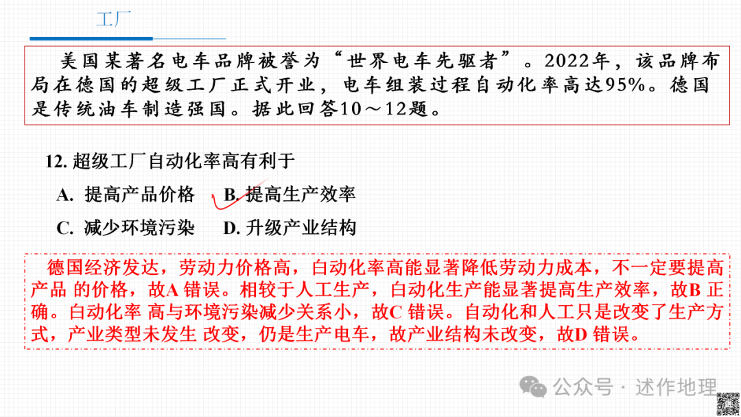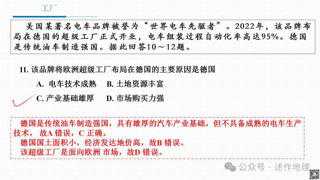 美国某著名电车品牌被誉为“世界电车先驱者”。2022年,该品牌布局在德国的超级工厂正式开业,电车组装过程自动化率高达95%。德国是传统油车制造强国。据此回答10~12题。