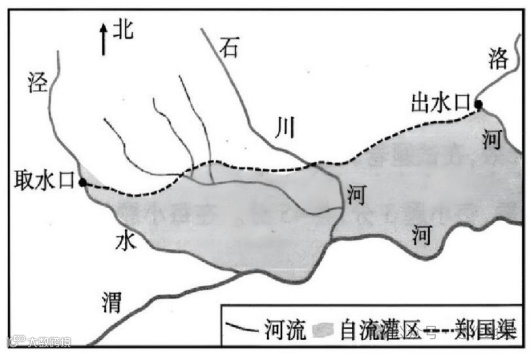 淤灌是指在河道或沟口修堤筑坝,开渠建闸,引取高泥沙含量的浑水淤地和浇灌庄稼。中国秦代的郑 国渠充分利用地势特点,全灌区可实行自流灌溉,并改善灌区盐碱化等土壤问题,是关中平原典型的淤灌 工程。有民歌曰“泾水一石,其泥数斗。且溉且粪,长我禾黍”。历史上,郑国渠曾出现无法自流引水的 情况,故六次改变取水口的位置,大约唐朝时郑国渠基本废弃。如图为郑国渠示意图。