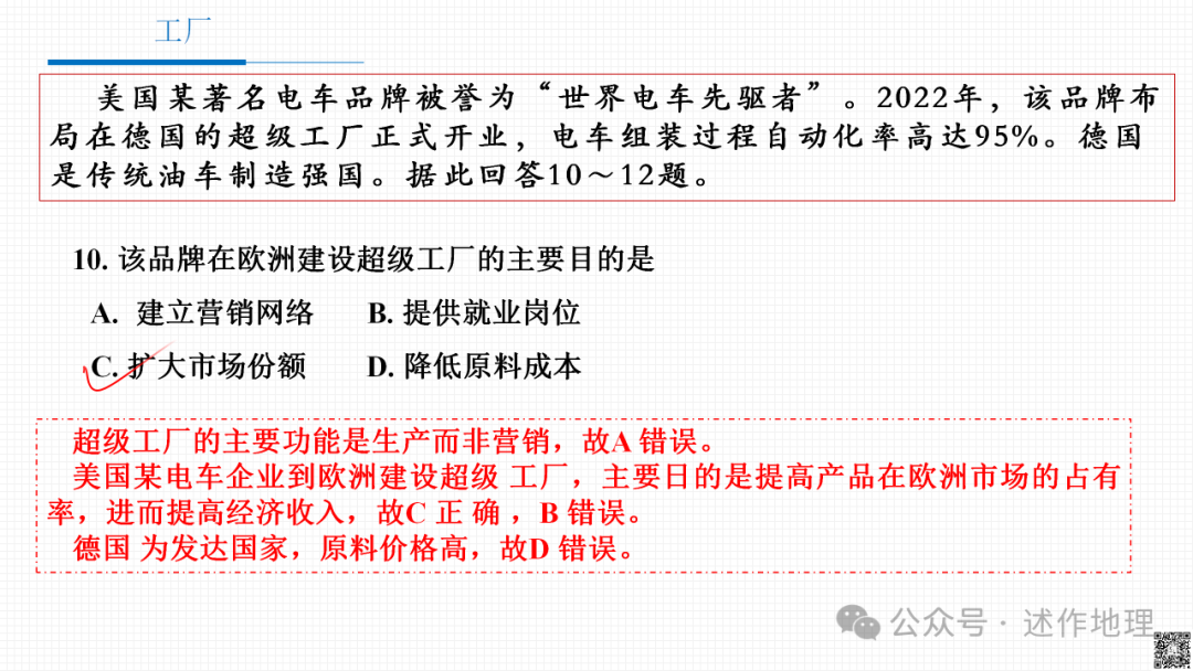 10.C【 解析】超级工厂的主要功能是生产而非营销,故A 错误。美国某电车企业到欧洲建设超级 工厂,主要日的是提高产品在欧洲市场的占有率,进而提高经济收入,故C 正 确 ,B 错误。德国 为发达国家,原料价格高,故D 错误。