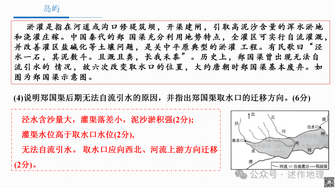 泾水含沙量大,灌渠落差小,泥沙淤积强(2分);灌渠水位高于取水口水位(2分),无法自流引水。取水口应向西北、河流上游方向迁移(2分)。