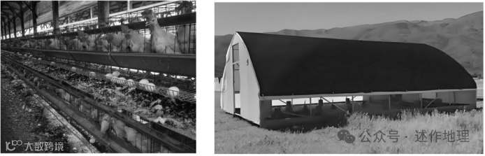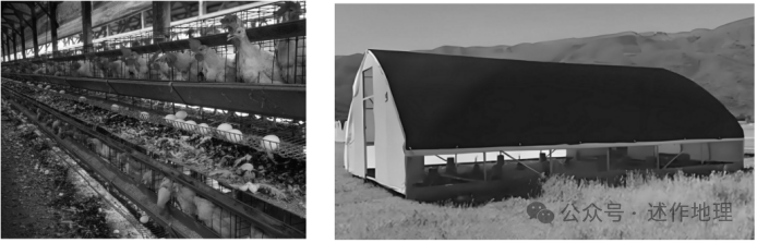 移动大棚养鸡是一种新型的养鸡模式。太阳能发电板驱动电机运转使大棚每天自动移动到草场的新位 置。每个大棚占地面积100多平米,内部放置饲料和水源,鸡可以在大棚内自由地吃草吃虫。左、右图分 别为圈养和移动大棚养鸡模式的景观图。据此回答6~7题。