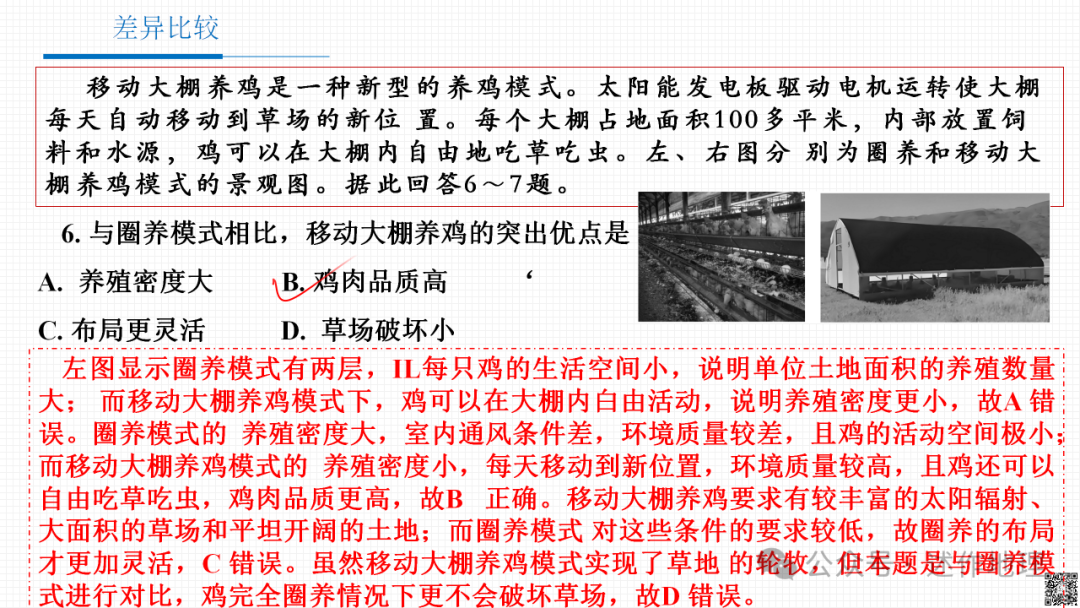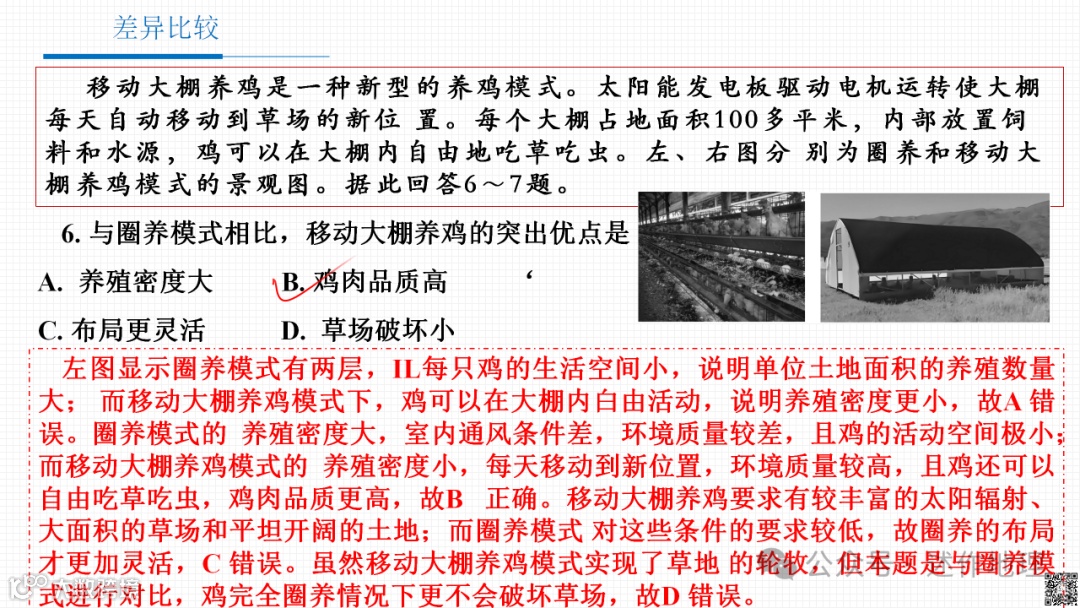 6.B【 解析】左图显示圈养模式有两层,IL每只鸡的生活空间小,说明单位土地面积的养殖数量大;而移动大棚养鸡模式下,鸡可以在大棚内白由活动,说明养殖密度更小,故A 错误。圈养模式的 养殖密度大,室内通风条件差,环境质量较差,且鸡的活动空间极小;而移动大棚养鸡模式的 养殖密度小,每天移动到新位置,环境质量较高,且鸡还可以自由吃草吃虫,鸡肉品质更高,故B 正确。移动大棚养鸡要求有较丰富的太阳辐射、大面积的草场和平坦开阔的土地;而圈养模式 对这些条件的要求较低,故圈养的布局才更加灵活,C 错误。虽然移动大棚养鸡模式实现了草地 的轮牧,但本题是与圈养模式进行对比,鸡完全圈养情况下更不会破坏草场,故D 错误。
