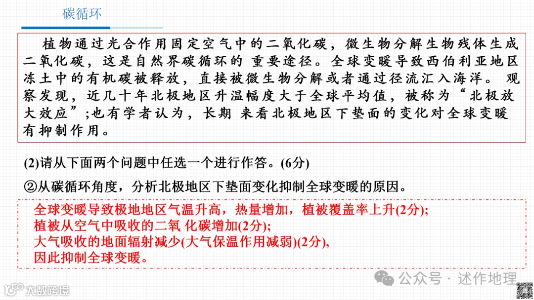 ②全球变暖导致极地地区气温升高,热量增加,植被覆盖率上升(2分);植被从空气中吸收的二氧 化碳增加(2分);大气吸收的地面辐射减少(大气保温作用减弱)(2分),因此抑制全球变暖。