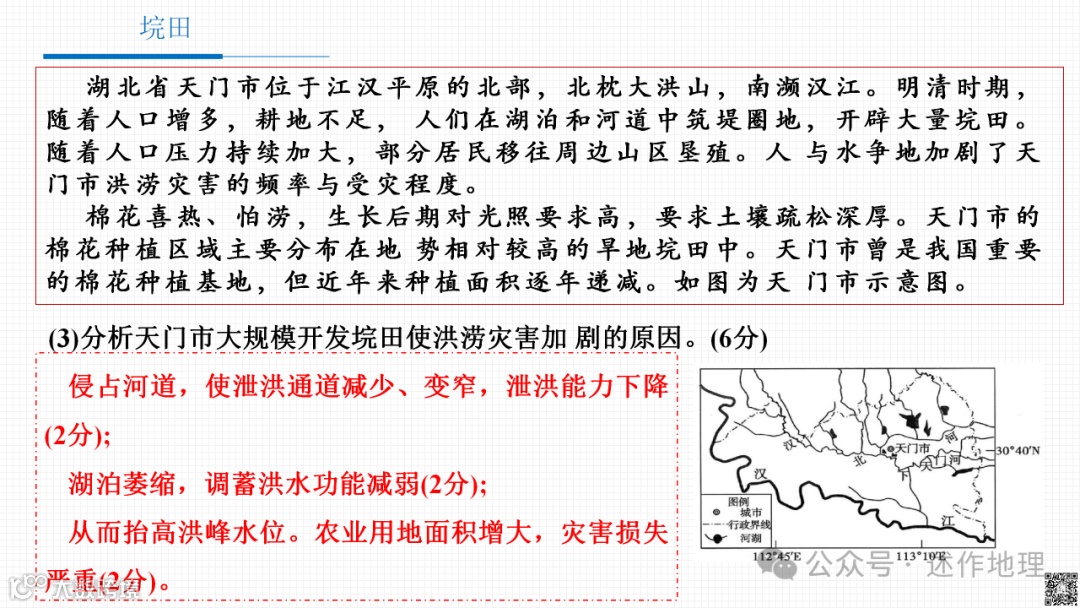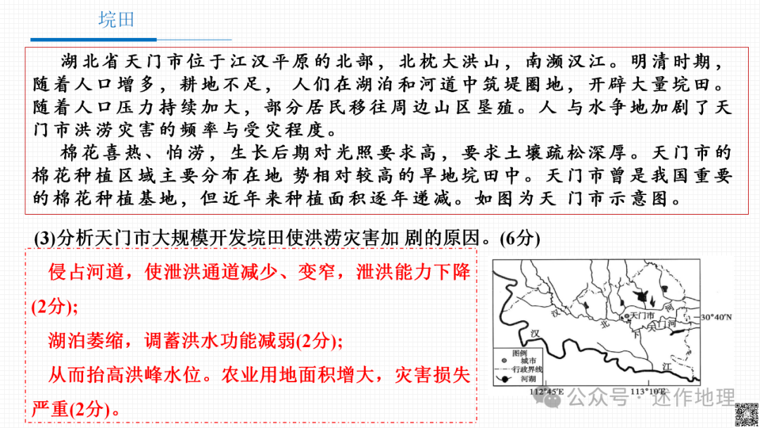 (3)分析天门市大规模开发垸田使洪涝灾害加 剧的原因。(6分)