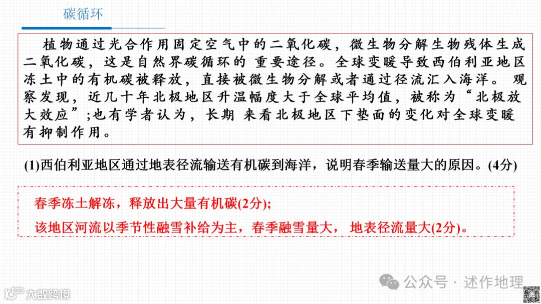 (1)西伯利亚地区通过地表径流输送有机碳到海洋,说明春季输送量大的原因。(4分)