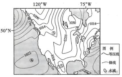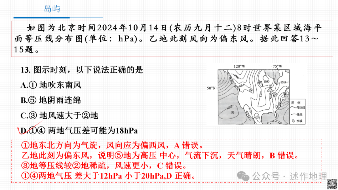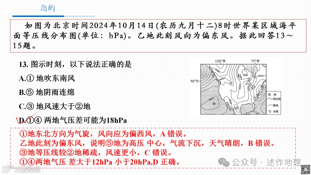 13.D【 解析】①地东北方向为气旋,风向应为偏西风,A 错误。乙地此刻为偏东风,说明⑤地为高压 中心,气流下沉,天气晴朗,B 错误。③地等压线较②地稀疏,风速更小,C 错误。①④两地气压 差大于12hPa 小于20hPa,D 正确。