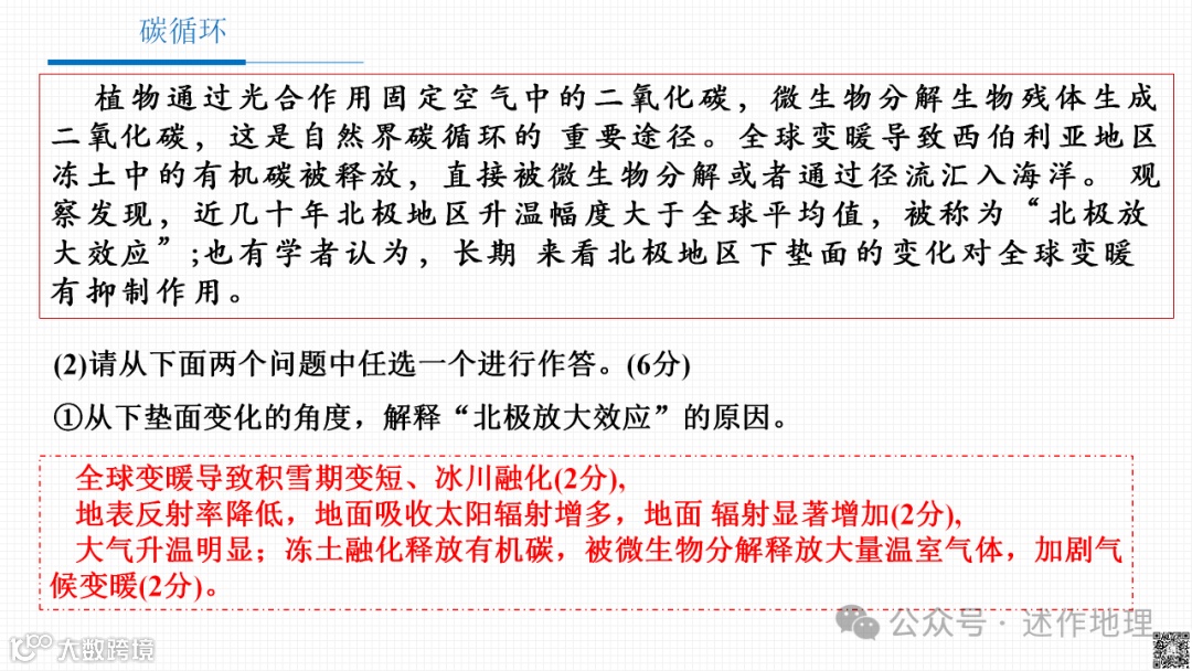 ① 全球变暖导致积雪期变短、冰川融化(2分),地表反射率降低,地面吸收太阳辐射增多,地面 辐射显著增加(2分),大气升温明显;冻土融化释放有机碳,被微生物分解释放大量温室 气体,加剧气候变暖(2分)。