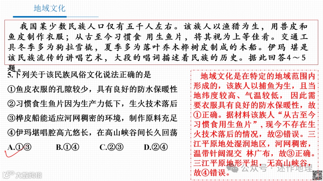 5.A【 解析】地域文化是在特定的地域范围内形成的,该族人以捕鱼为生,且当地纬度较高、气温较低, 因此需要衣服具有良好的防水保暖性,故①正确。据材料该族人“从古至今习惯食用生鱼片”, 现今不存在生火技术落后的情况,故②错误。三江平原地处湿润地区,河网稠密,温带针阔混交 林广布,故③正确。三江平原地形平坦,无高山峡谷,故④错误。