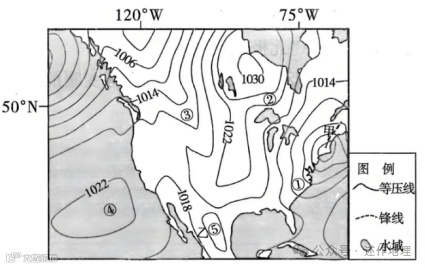 如图为北京时间2024年10月14日(农历九月十二)8时世界某区域海平面等压线分布图(单位:hPa)。乙地此刻风向为偏东风。据此回答13~15题。